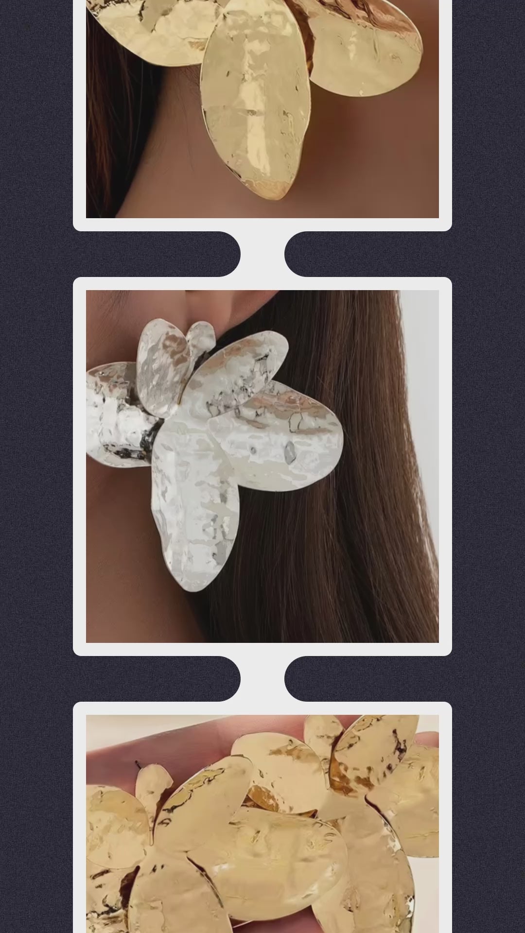 Los Aros Flor Metalizada reflejan el equilibrio perfecto entre fuerza y delicadeza. Su diseño floral XL, elaborado en metal liviano con textura martillada, crea un efecto brillante que captura la luz y transforma cualquier look en una declaración de estilo.